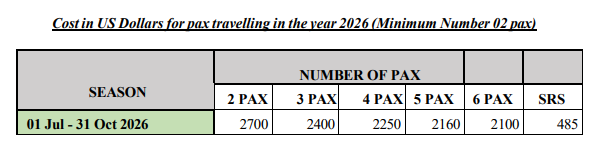 - • 500ml complementary drinking water per guest in the vehicle while on safari